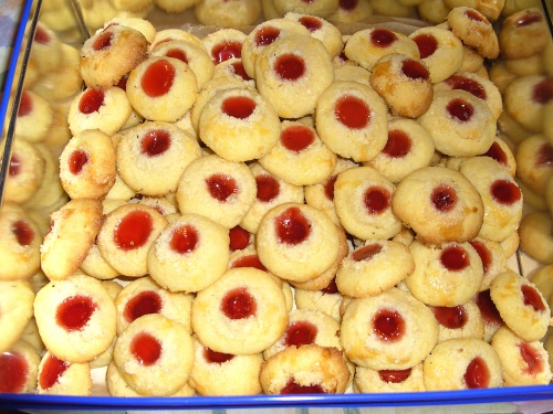 Die Butter wird schaumig gerührt, Eigelb, Zucker, Mehl und Vanille zugegeben und aus dieser Masse kleine Kugeln geformt, in deren Mitte man eine kleine Vertiefung mit dem Stiehl eines Holzrührlöffels drückt. Man bestreicht sie mit Eigelb, bestreut sie gemahlenen Mandeln und backt sie bei ca. 160 °C ca. 9 Minuten. In die Vertiefung gibt man dann einen Klecks Johannisbeergelee. Ich mache immer das Gelee heiß bis es flüssig ist und befördere es mit einer Spritze (bekommt man in der Apotheke) hinein.